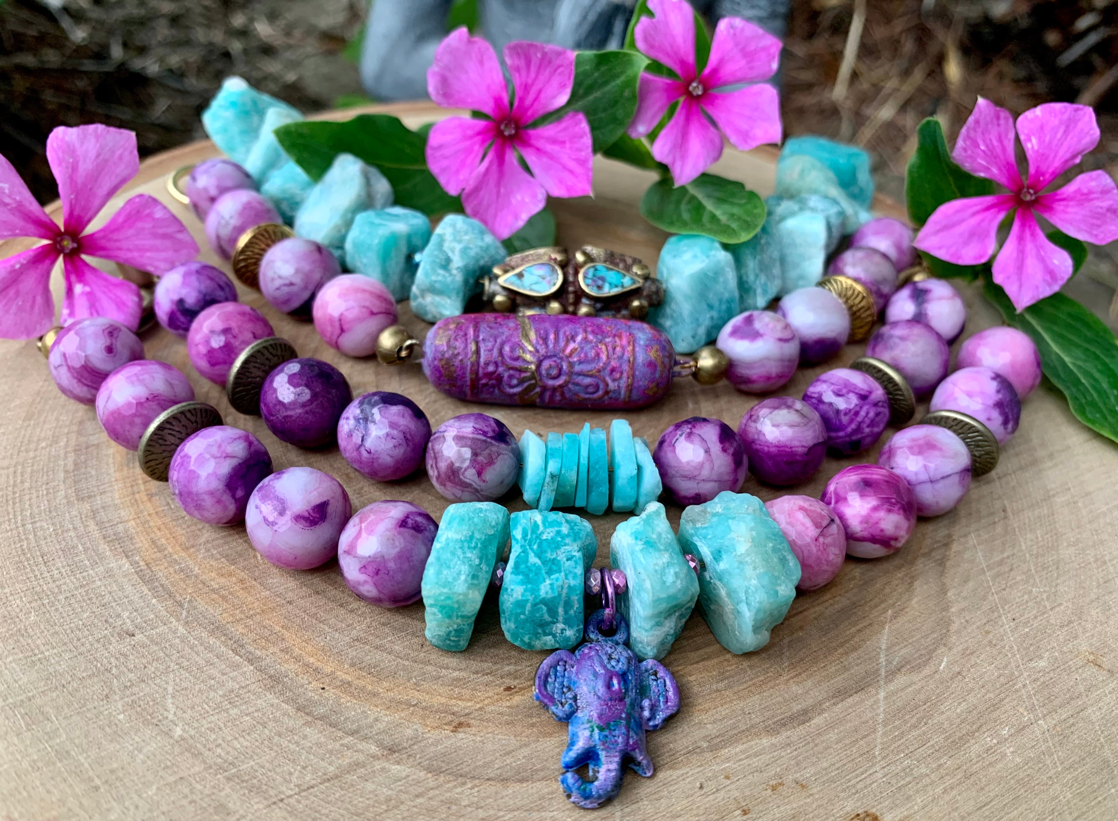 Bird Charm Iolite & Turquoise Bracelet Stack